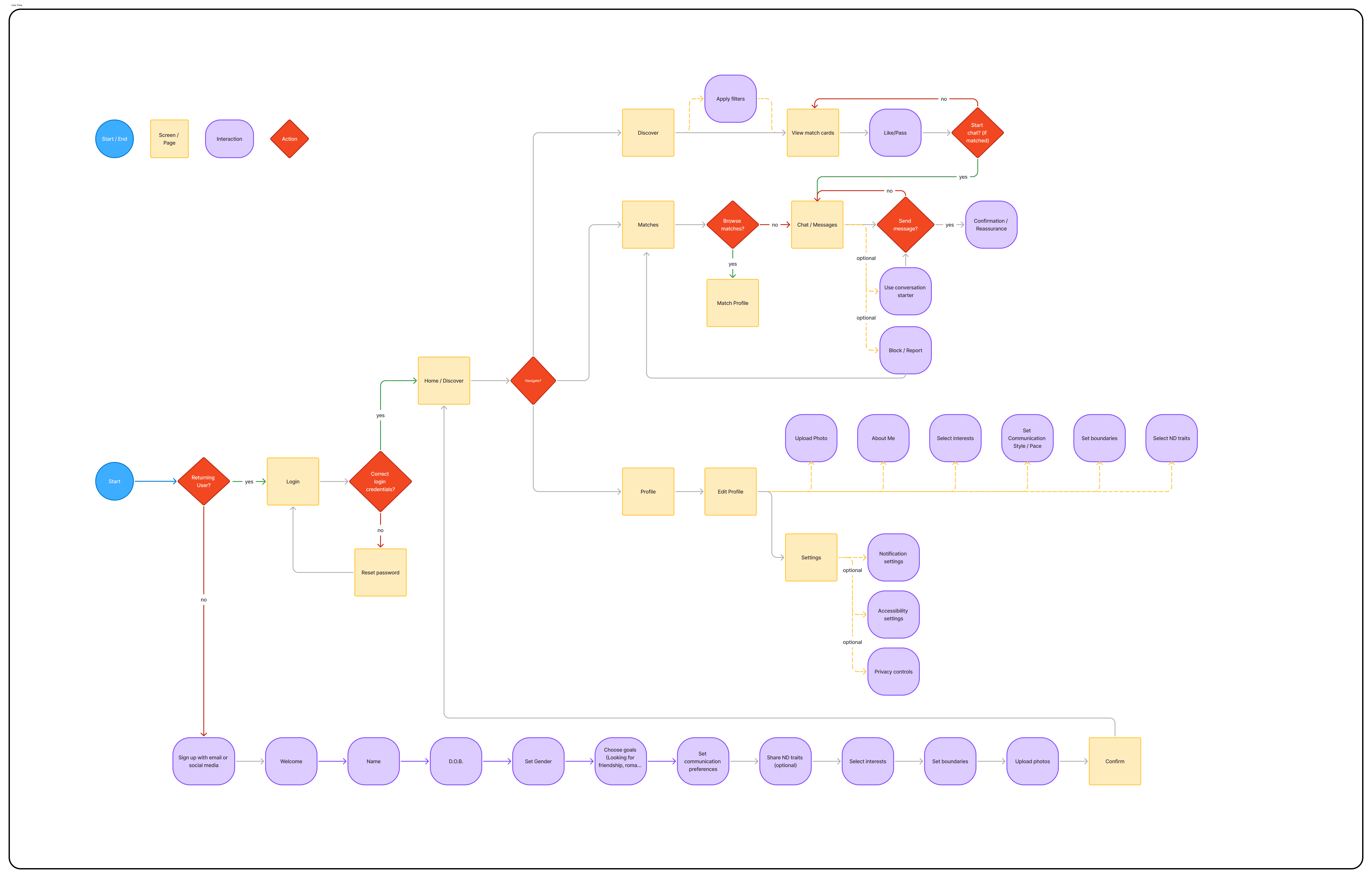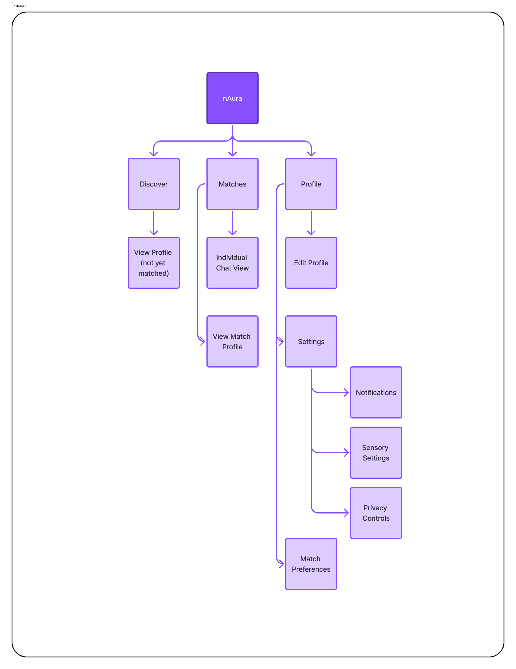 I organized essential actions like discovering profiles, matching, and editing personal settings into a simplified sitemap, ensuring the experience stayed lightweight and easy to navigate.