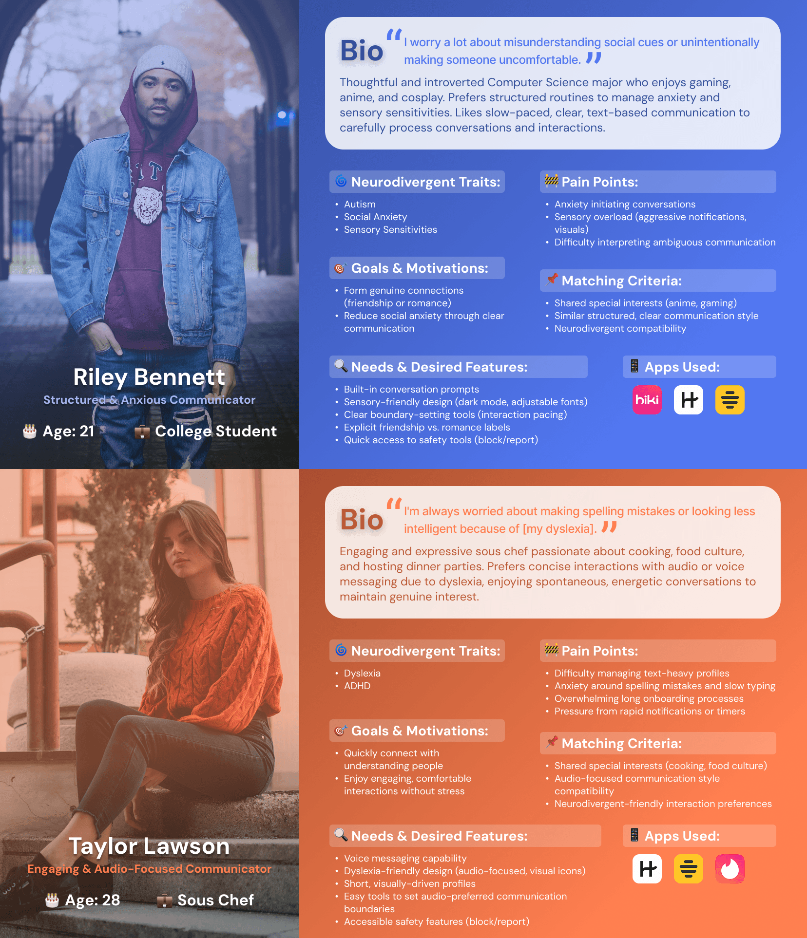 These interviews helped validate many of my initial assumptions about communication support while introducing new perspectives, especially around the importance of reducing sensory and social pressure in dating spaces.