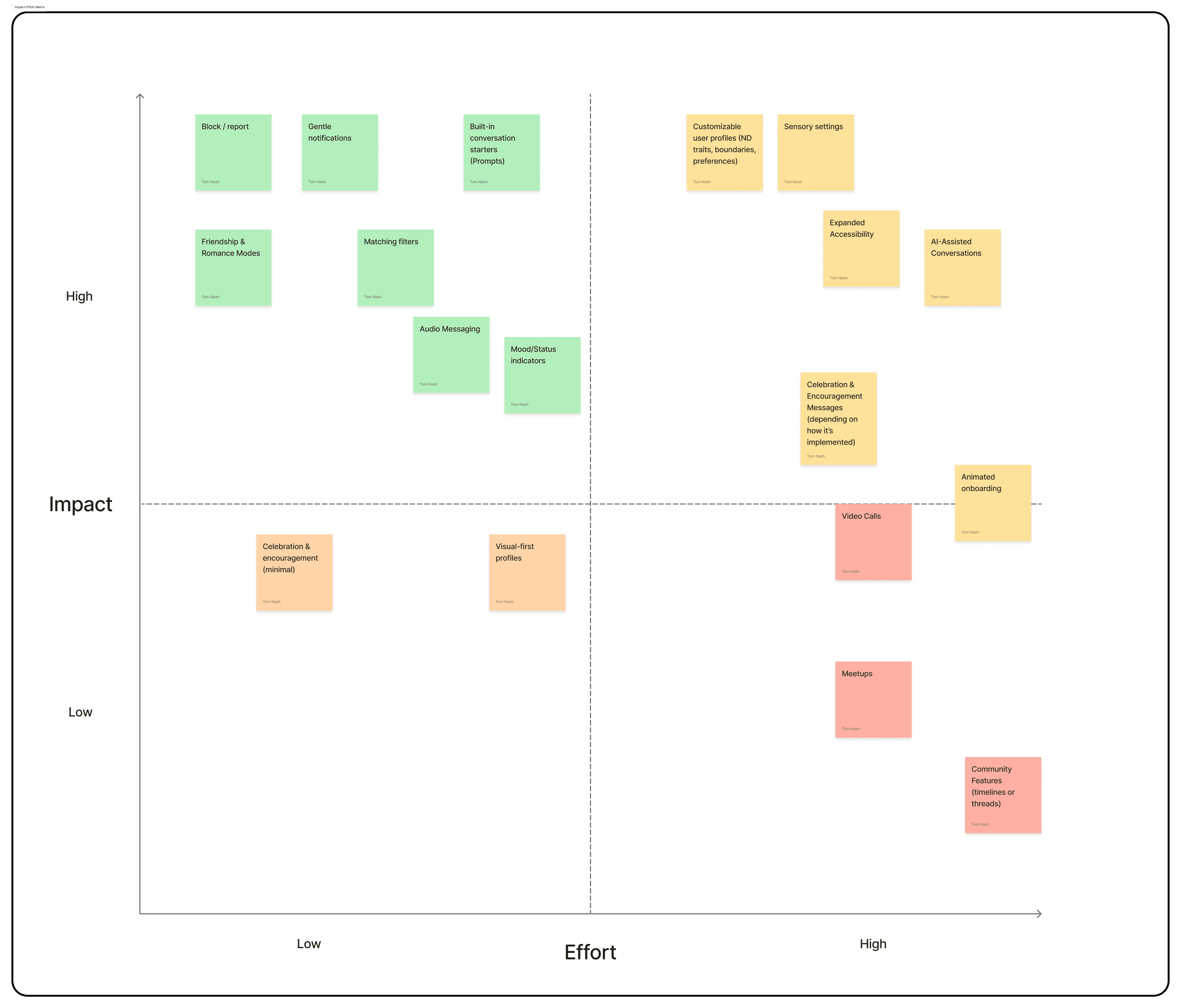I created an Impact-Effort Matrix to evaluate and prioritize features based on user insights, accessibility needs, and feasibility.