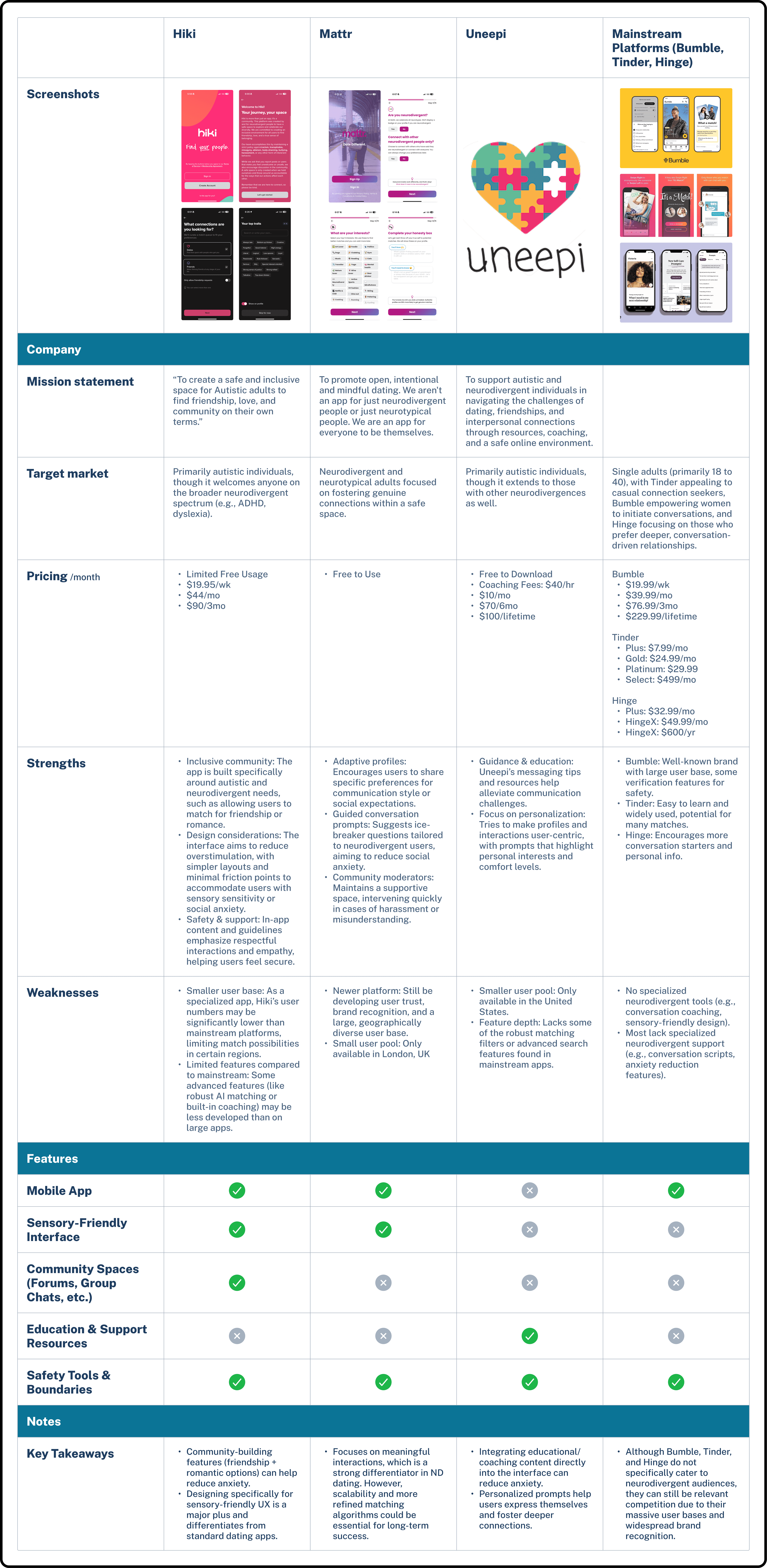 To better understand the landscape of both neurodivergent-focused and mainstream dating platforms, I first conducted a competitive analysis of existing apps. My goal was to identify where current solutions succeed, where they fall short (particularly for neurodivergent users) and where there’s space for innovation.